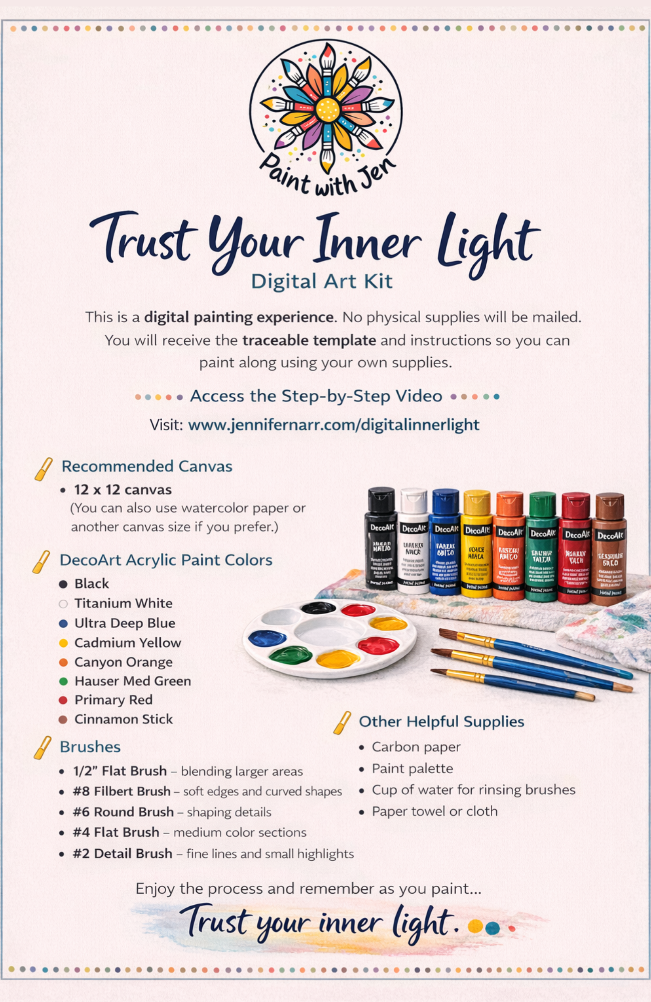 Trust Your Inner Light Your traceable downloads come in two sizes! 10x10 Traceable PDF Download 12x12 Traceable PDF Download DOWNLOADABLE Supply List Supply List